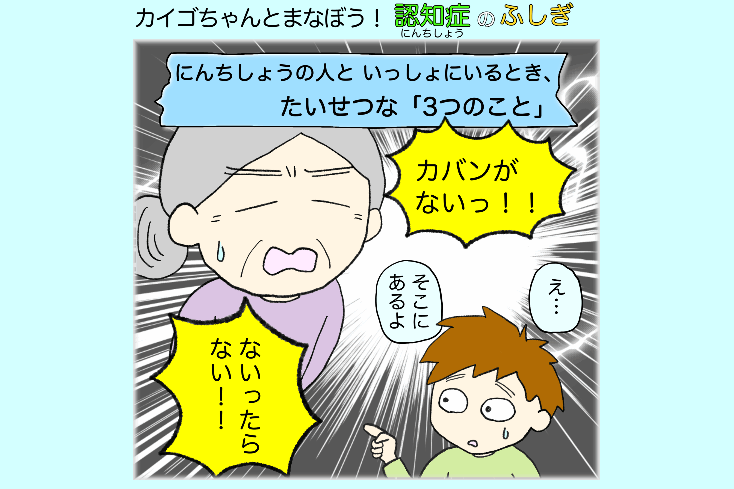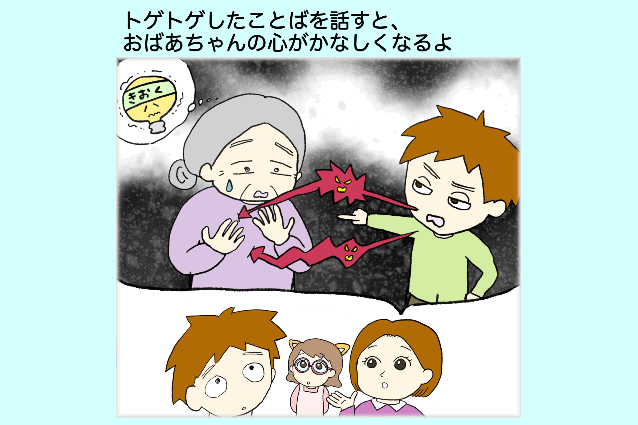 そんなときに「ちがう!」とつよくいわれると、おばあちゃんの心は「こわい」「かなしい」でいっぱいになっちゃうんだよ。