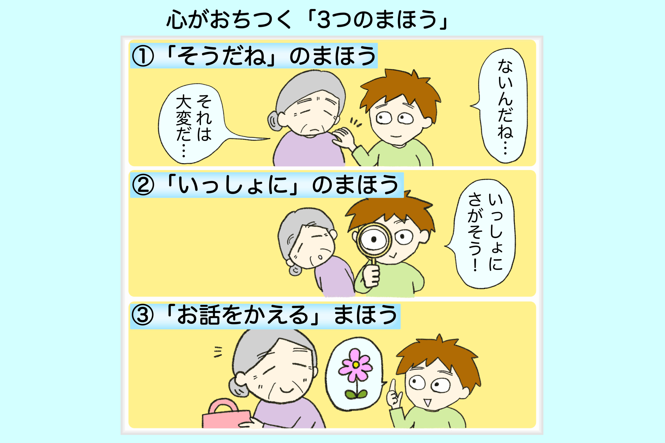 おばあちゃんに『あんしん』してもらうことが、いちばんたいせつだね。そんなときにつかえる、心がおちつく『3つのまほう』だよ。