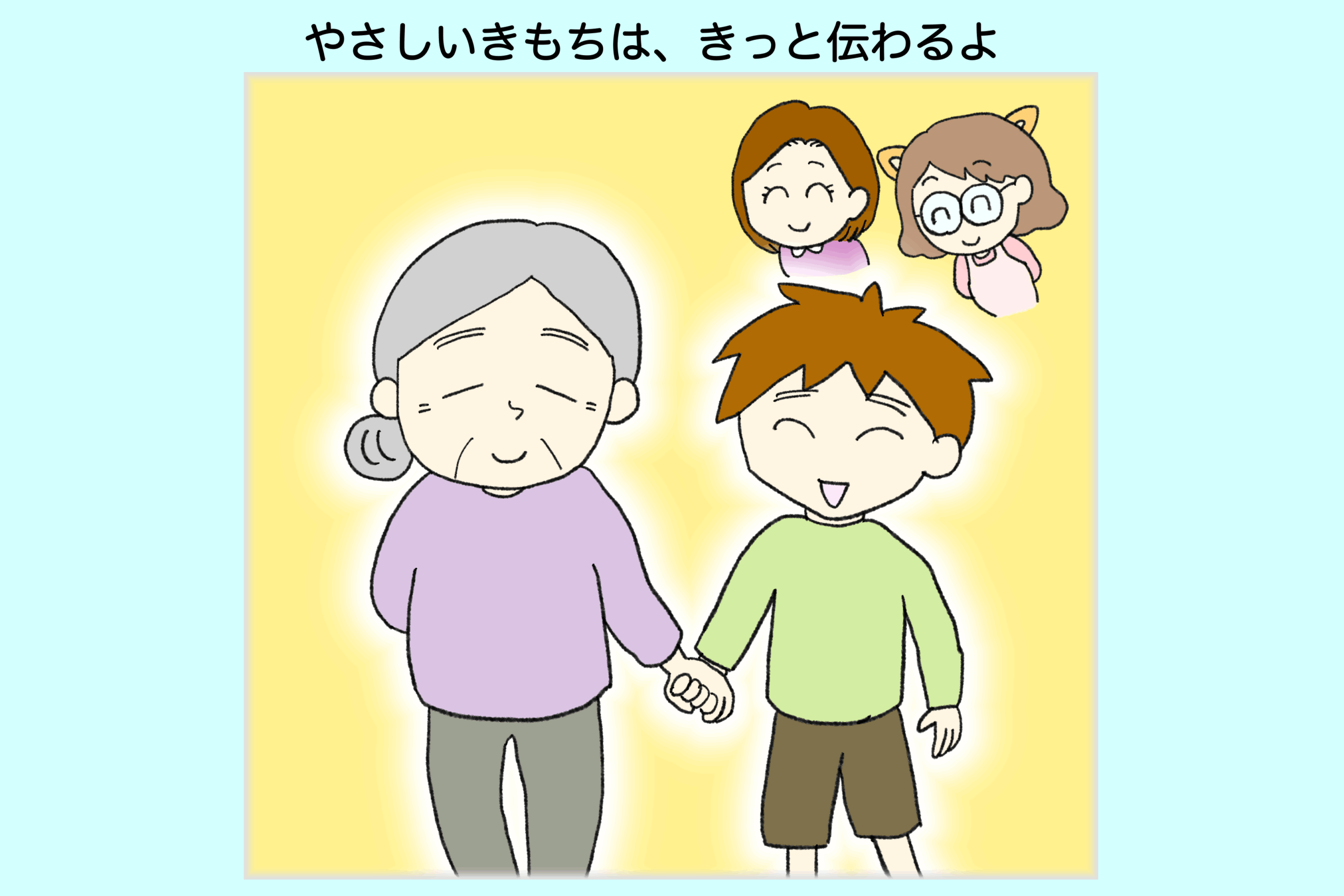 そのとおり!ほんとうのこととちがっているときもあるかもしれないけど、おばあちゃんのきもちをかんがえて、やさしいことばをかけるとあんしんできるよね。そうたくんのやさしいきもちも、ちゃんとつたわるよ。